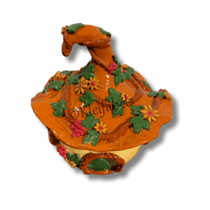 Techniek: Gietklei en geglazuurd, de binnenkant is hol en hier kan een waxinelichtje in geplaatst worden.