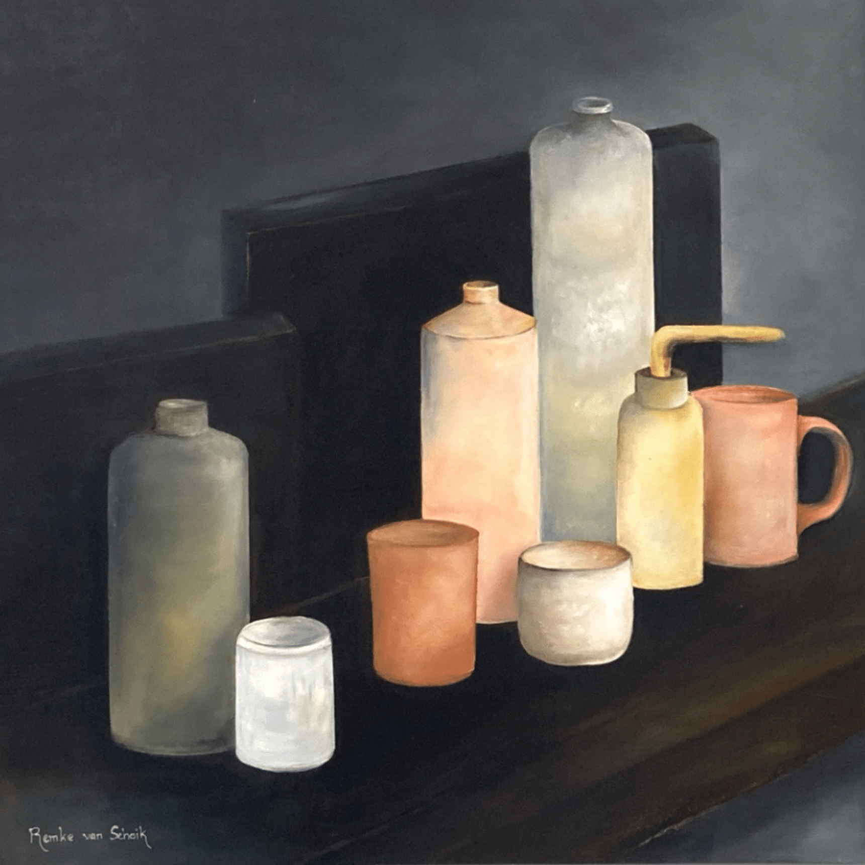 Kunstkaart 152 is een kaart met daarop het schilderij ‘Op de plank’ van Remke’s Atelier. Een mooi stil leven met flessen en kommetjes.